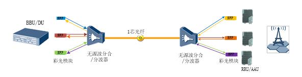 本方案在靠近DU/BBU侧安装有源波分设备,在AAU/RRU侧配置无源合分波器,并安装彩光模块,通过一芯或两芯光纤来实现波分复用,利用局端有源设备来实现局远端设备的有效监控。